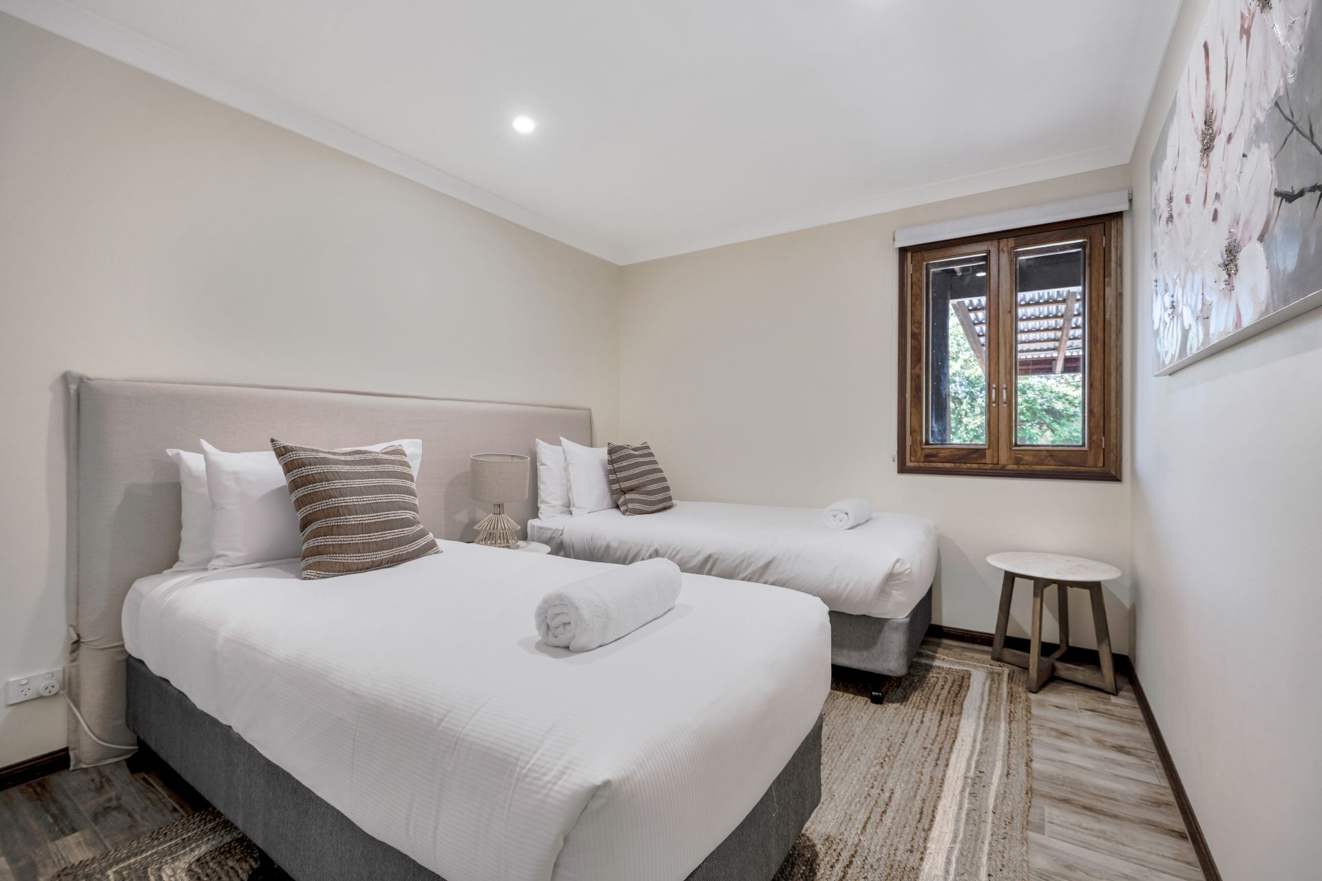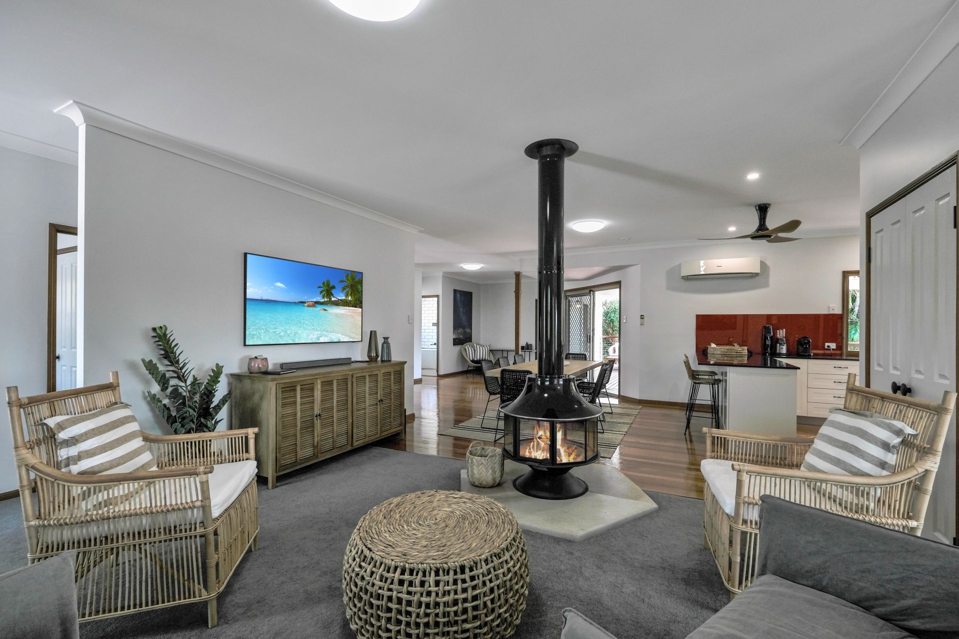 The upstairs area features three generously sized bedrooms, with the Master comprising a spacious king bed, Tv, walk-in robe, and ensuite. Additionally, there are two bathrooms, two spacious living areas, and two adjoining dining areas – formal and informal – providing ample space for your group to relax and indulge in quality time together. The internal slow-combustion fireplace adds a touch of warmth and coziness to the space, making it ideal for the cooler months.