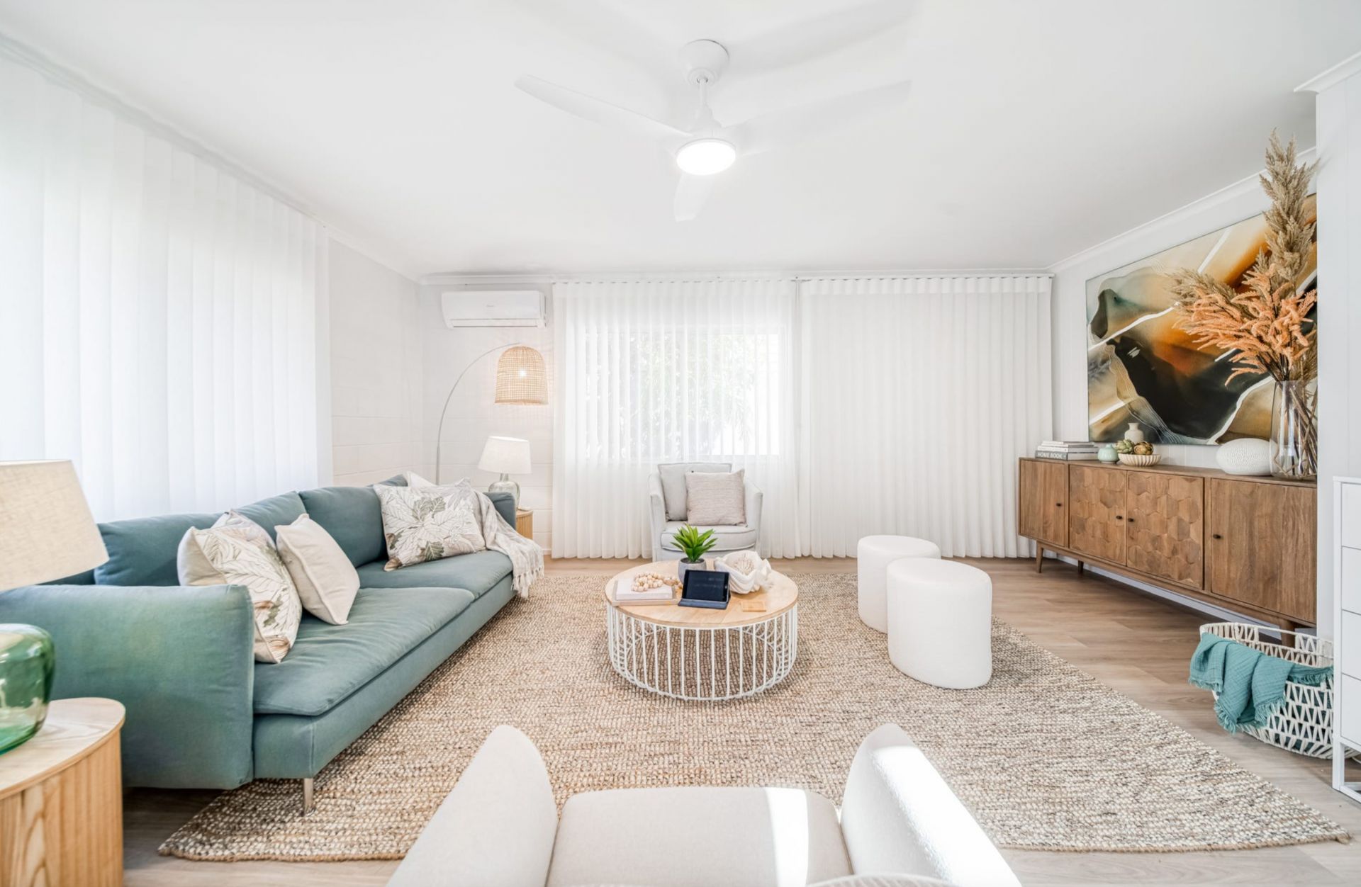 Both bedrooms are fitted with ceiling fans, and the home is filled with natural light throughout.
