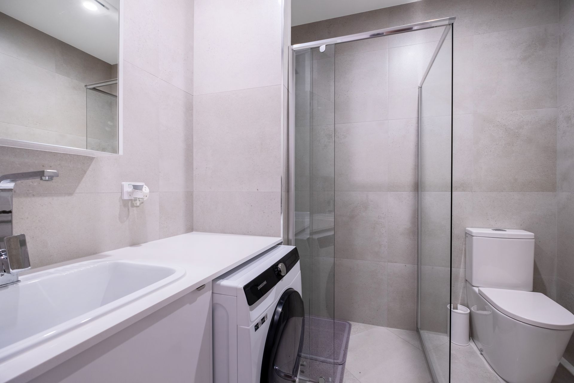 Two additional bathrooms are equally stylish, showcasing modern tiling, quality fixtures, and ample storage. A combined laundry and bathroom on the lower level.