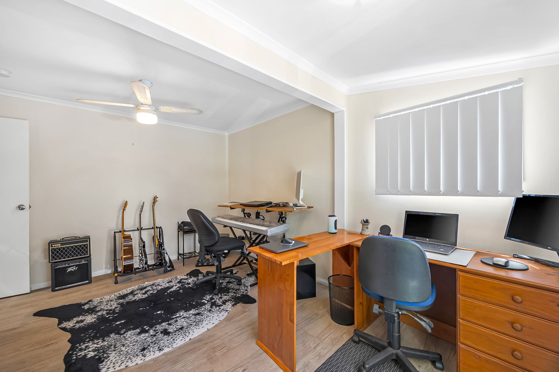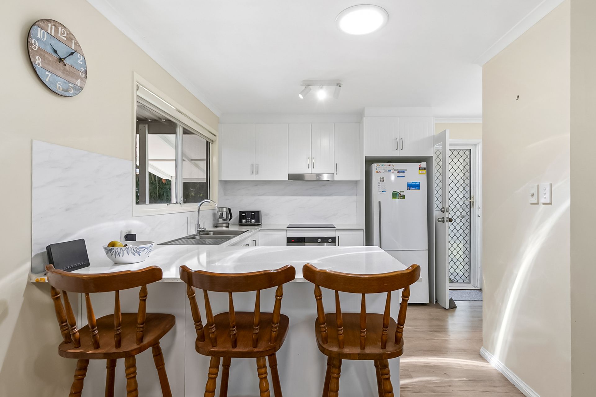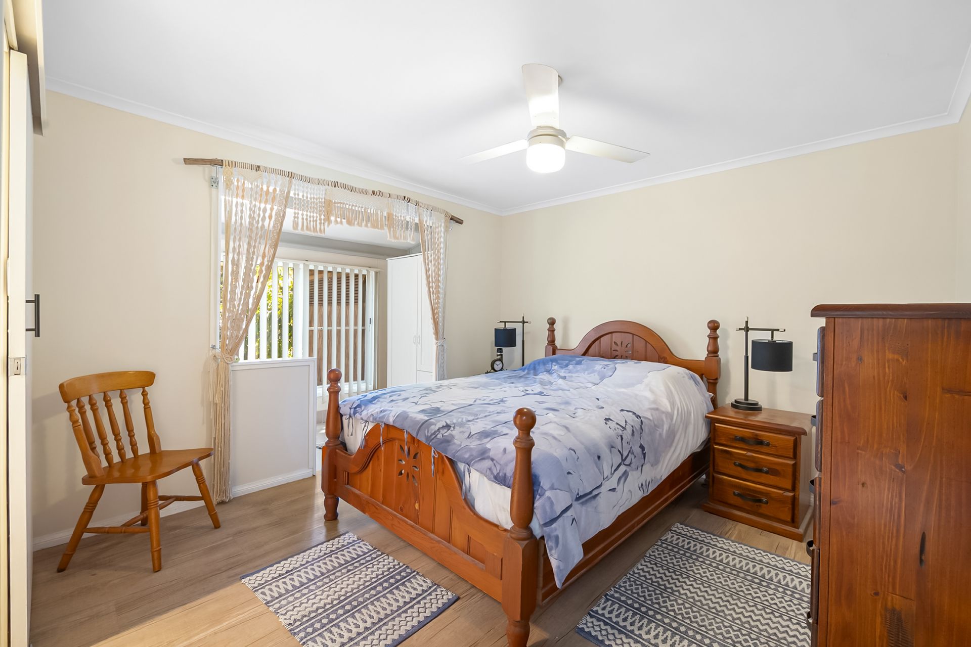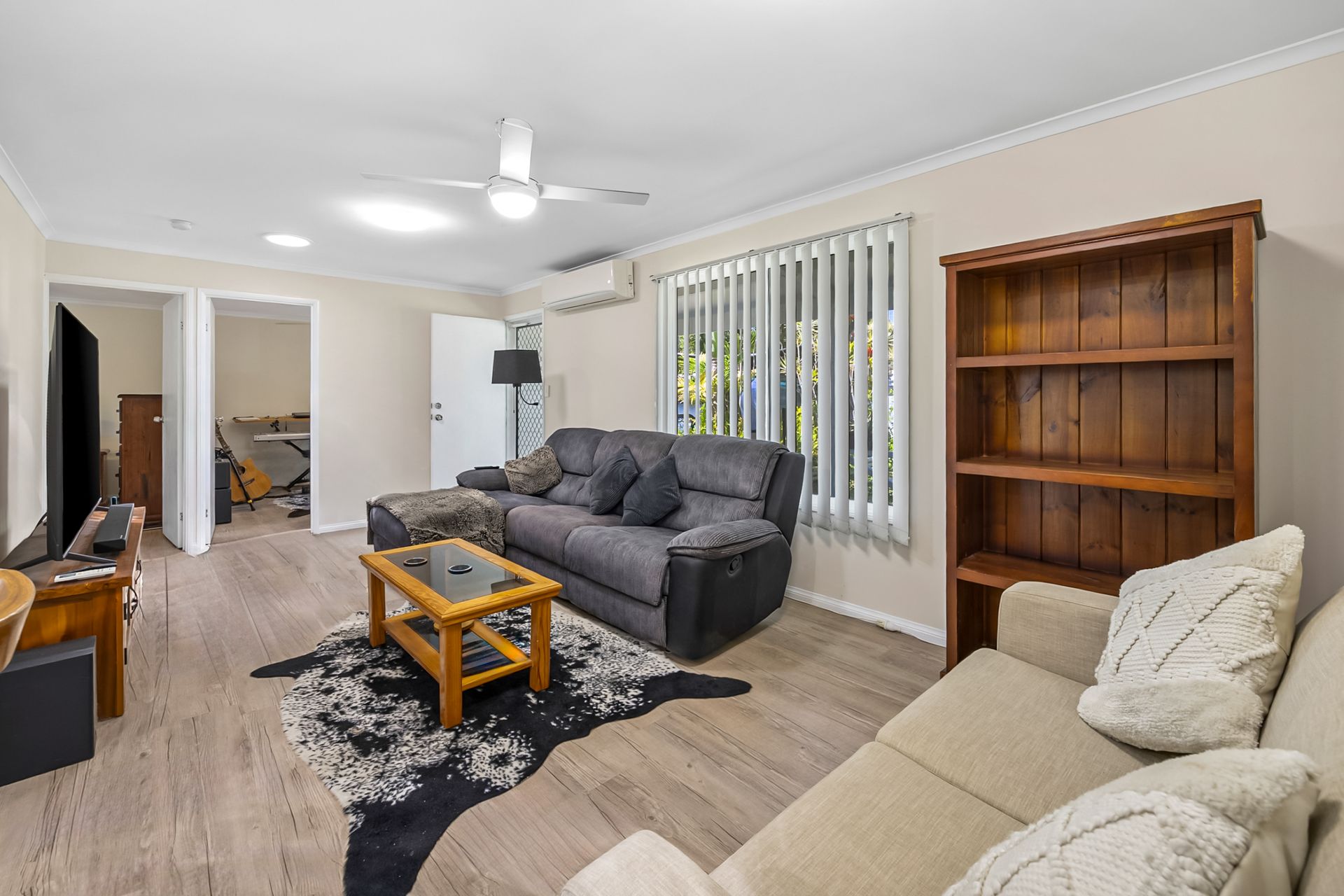 Inside, you’ll find a light-filled layout featuring two generous bedrooms, two bathrooms, and open-plan living enhanced by air conditioning for year-round comfort. The well-appointed kitchen flows seamlessly to the dining and living areas, creating a welcoming space for everyday living.