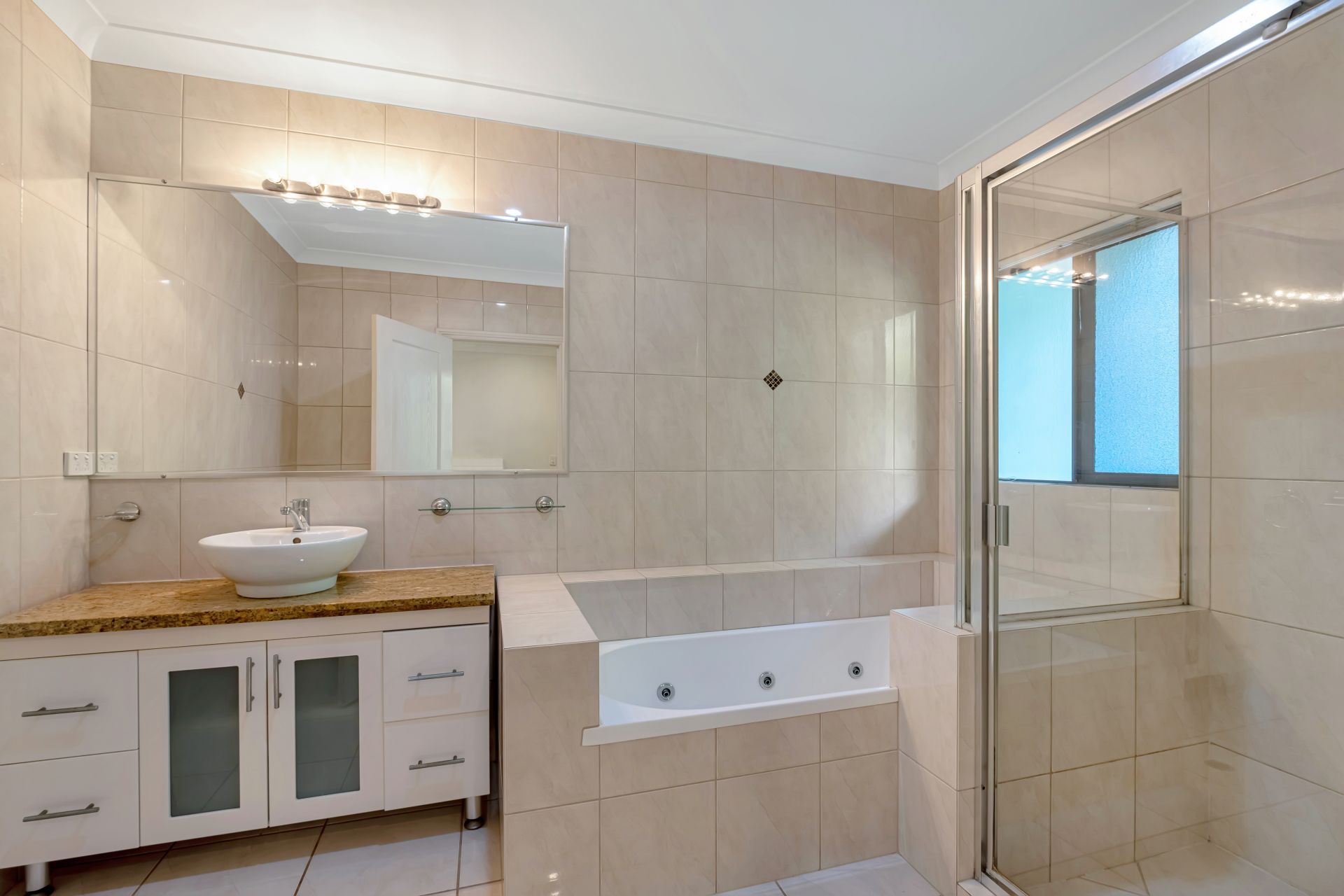 Two and a half bathrooms with floor-to-ceiling tiling and stone benchtops, including a main bathroom with a luxurious corner spa bath